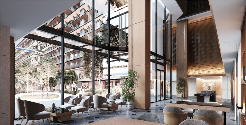 Trần căn hộ cao 3.5m, mặt dựng kính Low-E, mật độ xanh lớn, kiến tạo không gian sống sang trọng và gần gũi thiên nhiên.